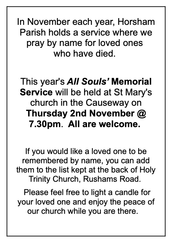 All Souls’ Memorial Service – St. Mary’s Church Image October 16, 2023rhodahatton Share this: Click to share on X (Opens in new window) X Click to share on Facebook (Opens in new window) Facebook Click to email a link to a friend (Opens in new window) Email Click to print (Opens in new window) Print Like Loading...